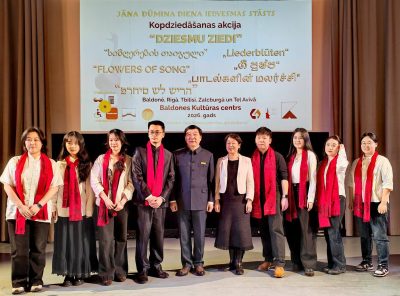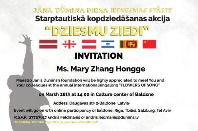 Šis starptautiskais pasākums ir veltīts ievērojamajam kordiriģentam Jānim Dūmiņam (1922–2011).. Dūmiņš vairākus gadus ražīgi strādāja Gruzijā, vadot Republikas Valsts kora kapellu (1957—1967). un Tbilisi Valsts Operas un Baleta teātra kori (1982—1985). Viņš bija arī profesors Tbilisi konservatorijā un saņēma goda nosaukumu – Gruzijas Nopelniem bagātais mākslas darbinieks (1958). Nav nejaušība, ka tieši no šīs dienvidu valsts jauniešu koris tika uzaicināts dziedāt J. Dūmiņa starptautiskā multimediālā kopdziedāšanas akcija “DZIESMU ZIEDI”.Baldonē. Runājam par Tbilisi Revaza Lagidzes Mūzikas un Mākslas skolas kori. Ir nepieciešams atzīmēt I.Kozakēvičas LNKBA aktīvistu Meri Čangas un Imedi Kokajas aktīvu līdzdalību pasākumā. Paldies viņiem par entuziasmu, par spēju apvienot cilvēkus ar kopīgiem mākslinieciskiem mērķiem un risinājumiem.