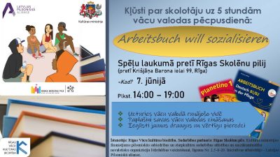 Rīgā, tā dēvētajā “Baronielas sporta laukumā” 7. jūnijā skanēs vācu valoda.  Rīgas Vācu kultūras biedrība sadarbībā ar Rīgas Skolēnu pils vācu valodas pulciņu organizēs atraktīvu mācībstundu “Arbeitsbuch will sozialisieren” jeb “Vācu valodas darba grāmata vēlas socializēties”! Pasākums orientēts uz skolu jauniešiem, lai popularizētu vācu valodas apguvi. Atraktīvā formātā katram dalībniekam vajadzēs no kopīgā plaukta izvēlēties vienu lietotu vācu valodas mācību grāmatu/ burtnīcu un caur mūziku, galda spēlēm, dīvainiem teikumu piemēriem un atskaņām kļūt par vācu valodas “skolotāju” uz 1 dienu! Pasākums ļaus pēc iespējas ilgi uzturēties vācu valodas vidē, apgūt svešvalodas, integrēties dažādu etnisko grupu jauniešiem uz vienotas bāzes – paredzot, ka daudziem ir vājš vācu valodas līmenis. Pasākums vienlaikus dos ieguldījumu plānotajā izglītības reformā, kurā tiks aktīvi veicināta vācu valodas kā  svešvalodas apguve.